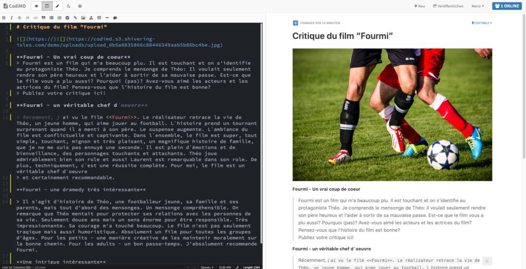 Die Eingabe der Textbausteine und die Formatierung erfolgt über das Editorfenster (alternativ kann natürlich auch in der Markdown-Programmiersprache geschrieben werden). Die Oberfläche ist jedoch einer Schreiboberfläche in einem Textbearbeitungsprogramm ähnlich, sodass keine Programmierkenntnisse nötig sind. Einige Formatierungsoptionen hübschen das Pad allerdings optisch stark auf: