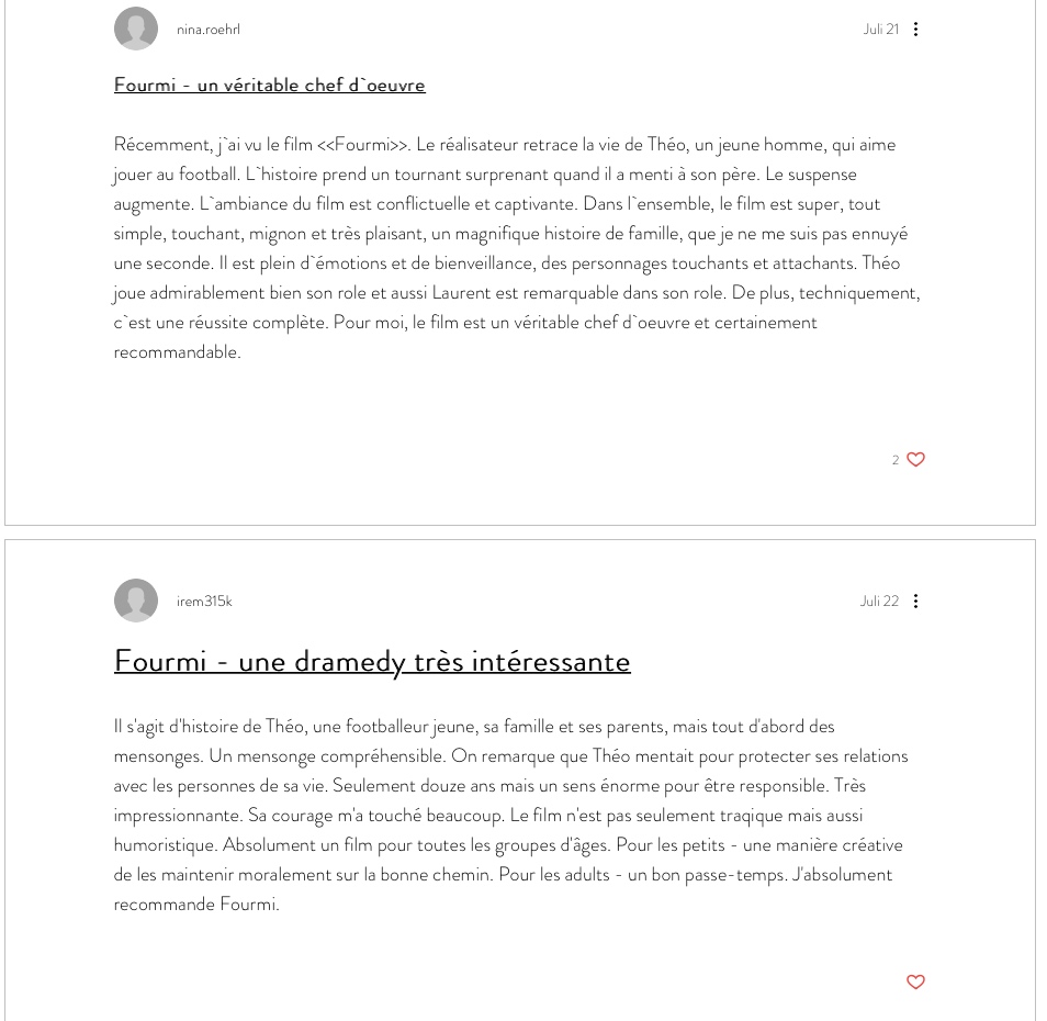 Ausgearbeitete Unterrichtseinheiten für das Verfassen einer Rezension finden Sie im Guide pédagogique zum Film Fourmi. Die Unterrichtseinheiten sind für die 8. – 10. Klasse konzipiert und lassen sich dementsprechend in ihrer Komplexität an die Lernstufe anpassen.