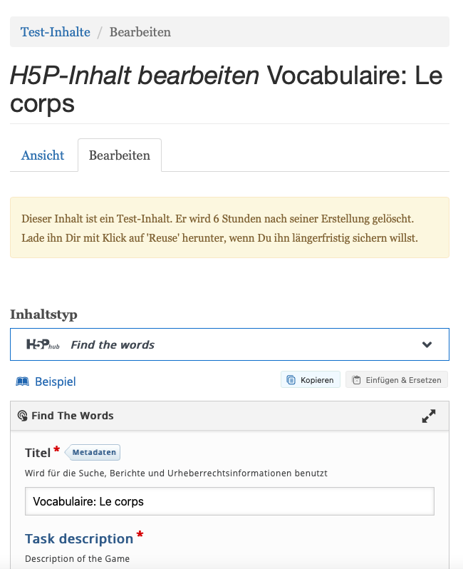 Im gezeigten Screenshot habe ich die zu suchenden Wörter einfach aus der Wortschatzliste kopiert und in die Maske auf EinstiegH5P eingefügt.