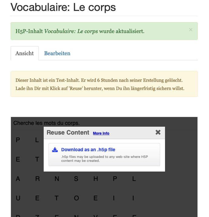 die interaktive Übung testen und – falls alles passt – mit dem Befehl „Reuse Content“ herunterladen