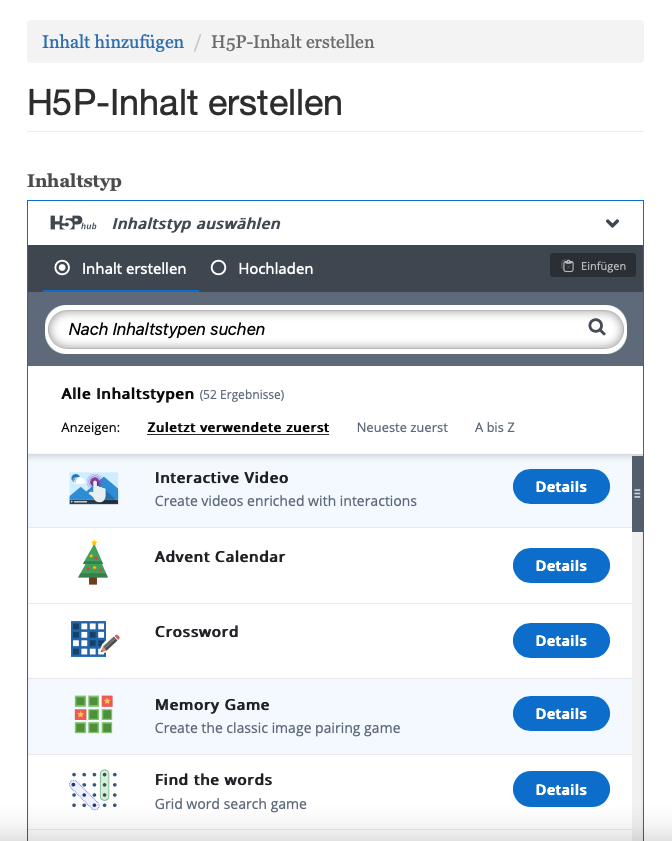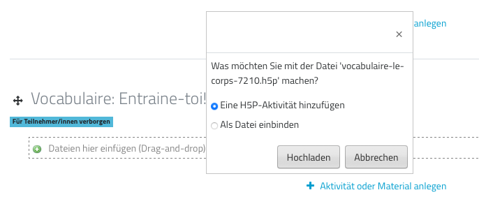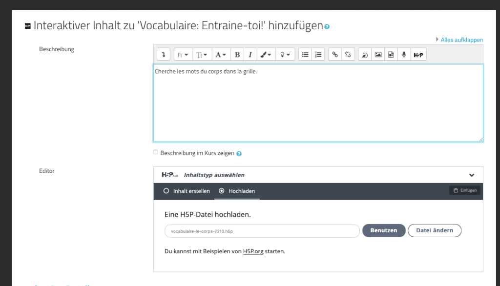 Die H5P-Datei hochladen (Befehl „Benutzen“).