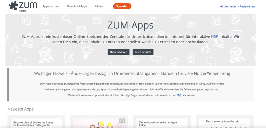 ZUM-Apps ist ein Projekt der Zentrale für Unterrichtsmedien im Internet und erlaubt ebenfalls die Erstellung und das Teilen von interaktiven H5P-INhalten im Browser.