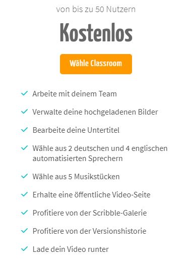 Um MySimpleShow als Lehrkraft kostenlos nutzen zu können, müssen Sie sich als Lehrkraft registrieren und die Option „Classroom“ wählen. Rufen Sie hierzu auf der Startseite den Reiter „Preise“ auf, wählen Sie den Bildungsbereich (weiter unten neben den Icons „Spaß“ und  „Unternehmen“. Mysimpleshow fordert dann eine Bestätigung Ihrer Schule über die Schulzugehörigkeit per E-Mail ein. Leider ist die Vertonung mit der eigenen Stimme im Gratis-Education-Account nicht mehr möglich: Eine Lösung ist es jedoch, die Schüler:innen separat die Audiospur vertonen zu lassen und im Nachhinein die Audio-Stimme der Schüler:innen über das Video zu legen. Die typsichen „Wisch-Effekte“ und die Musikbegleitung sind dann natürlich leider verloren.