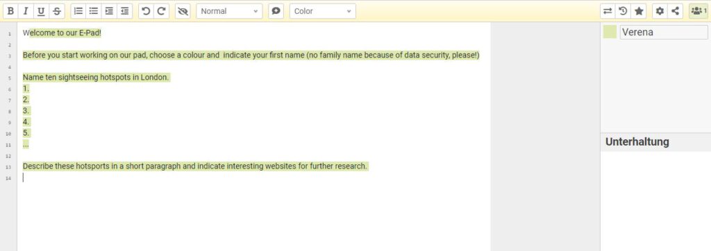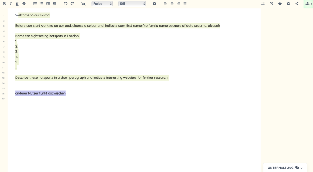 - Die Lernenden schreiben zeitgleich oder zeitversetzt auf einer beschreibbaren Webseite im Internet, die sie über die URL (Webadresse) erreichen. Bilder, Audios oder Videos können nicht eingefügt werden. Links werden in der Regel automatisch erkannt.