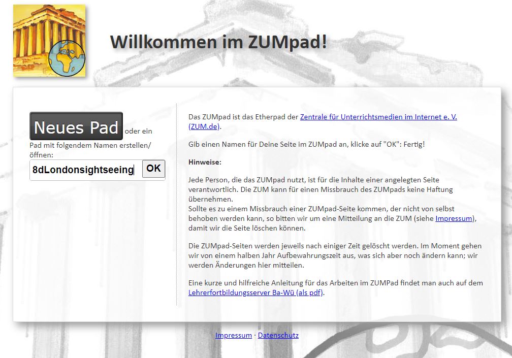 Haben Sie Lust die Funktionalität des E-Pads gleich selbst auszuprobieren, dann folgen Sie dem Link und tragen Sie Ihre didaktischen Ideen zu folgender Frage in das Dokument ein: Für welche Zwecke könnten Sie so ein ZumPad gewinnbringend im Unterricht einsetzen?