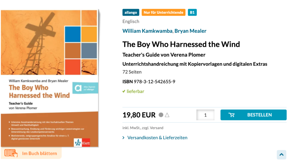 Verena Plomer, Teacher's Guide, The boy who harnessed the wind, Stuttgart: Ernst Klett Sprachen, 2023, S. 8.