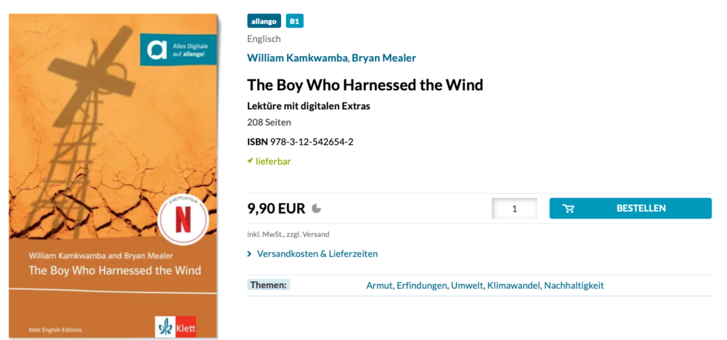 „Der 13-jährige William Kamkwamba wächst auf einer kleinen Farm in Malawi auf, einem der ärmsten Länder der Welt. 2002 kommt es nach schweren Überschwemmungen und nachfolgender Dürre zur schlimmsten Hungersnot seit 50 Jahren. Williams Vater kann die Schulgebühren für seinen Sohn nicht mehr aufbringen. Doch William gibt nicht auf. In der Schulbibliothek leiht er sich Bücher aus und eignet sich selbst Wissen an. In einem Physikbuch findet er die Bauanleitung für eine Windmühle. Mit 14 Jahren baut er ein Windrad, mit dem er Strom erzeugen und Wasser für die Bewässerung der Felder seiner Familie pumpen kann.“ (Quelle: https://www.klett-sprachen.de/the-boy-who-harnessed-the-wind/t-1/9783125426542)